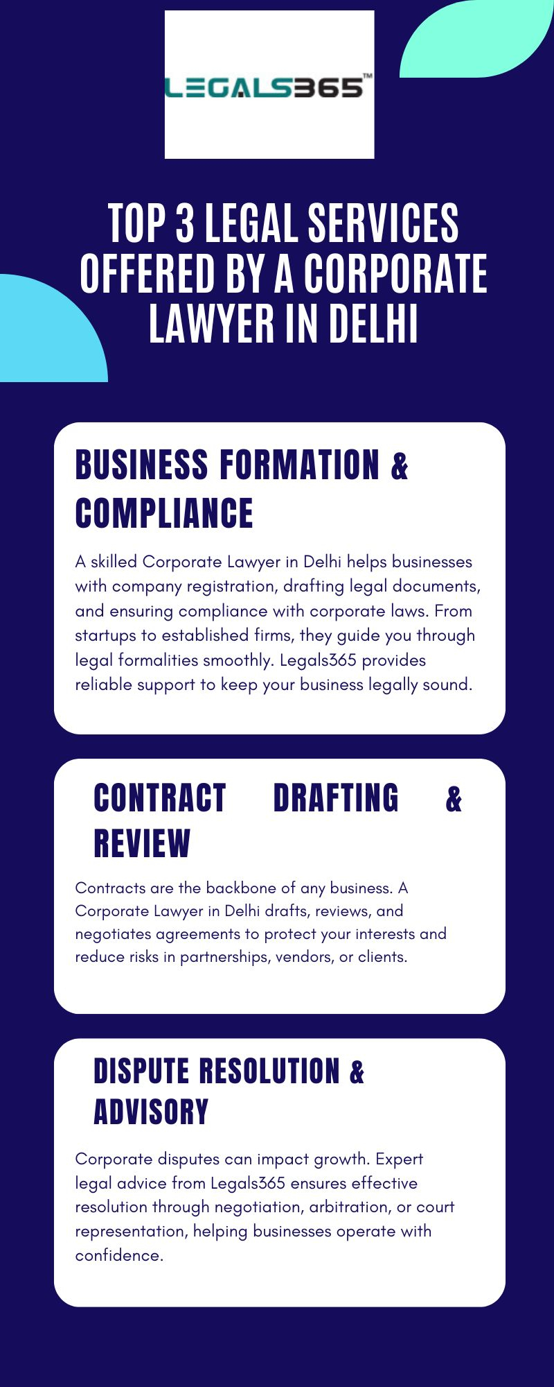 Visit us:- https://www.legals365.com/corporate-lawyers-in-delhi/Top 3 Legal Services Offered by a Corporate Lawyer in Delhi 1. Business Formation & Compliance A skilled Corporate Lawyer in Delhi helps businesses with company registration, drafting legal documents, and ensuring compliance with corporate laws. From startups to established firms, they guide you through legal formalities smoothly. Legals365 provides reliable support to keep your business legally sound. 2. Contract Drafting & Review Contracts are the backbone of any business. A Corporate Lawyer in Delhi drafts, reviews, and negotiates agreements to protect your interests and reduce risks in partnerships, vendors, or clients. 3. Dispute Resolution & Advisory Corporate disputes can impact growth. Expert legal advice from Legals365 ensures effective resolution through negotiation, arbitration, or court representation, helping businesses operate with confidence. Visit us:- https://www.legals365.com/corporate-lawyers-in-delhi/0 Reacties 0 aandelen 214 Views 0 voorbeeld -
