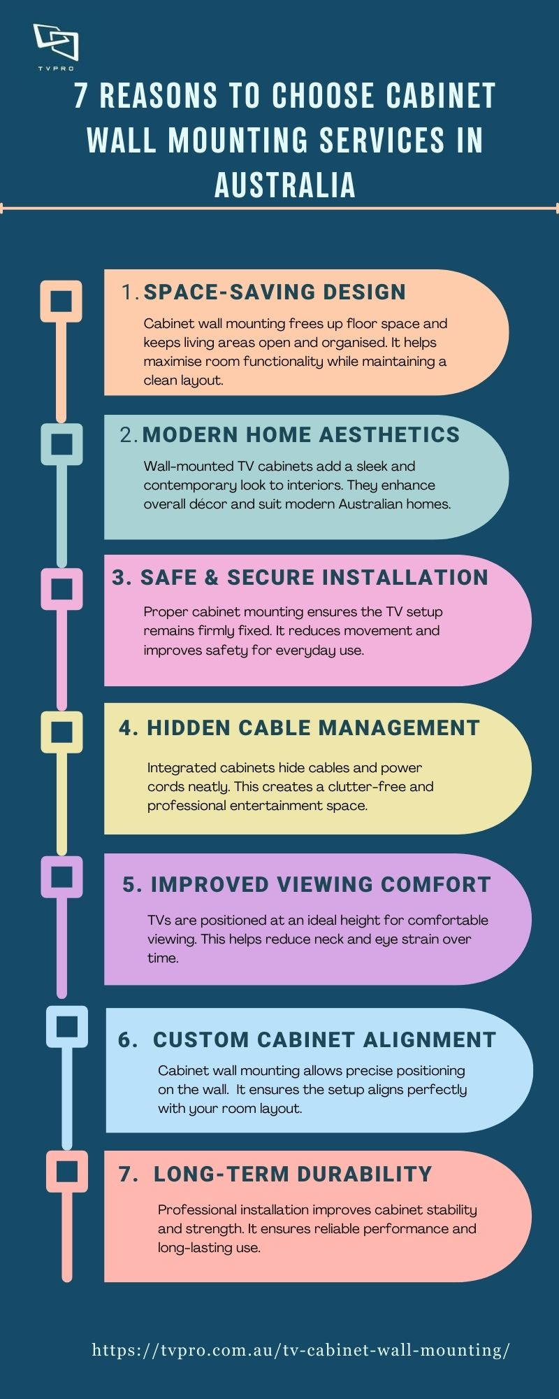 This infographic explains the key benefits of cabinet wall mounting services in Australia, including space efficiency, modern design, cable management, and secure TV placement. Ideal for homeowners planning a stylish and functional TV cabinet wall mounting solution. For more information visit our website https://tvpro.com.au/tv-cabinet-wall-mounting/