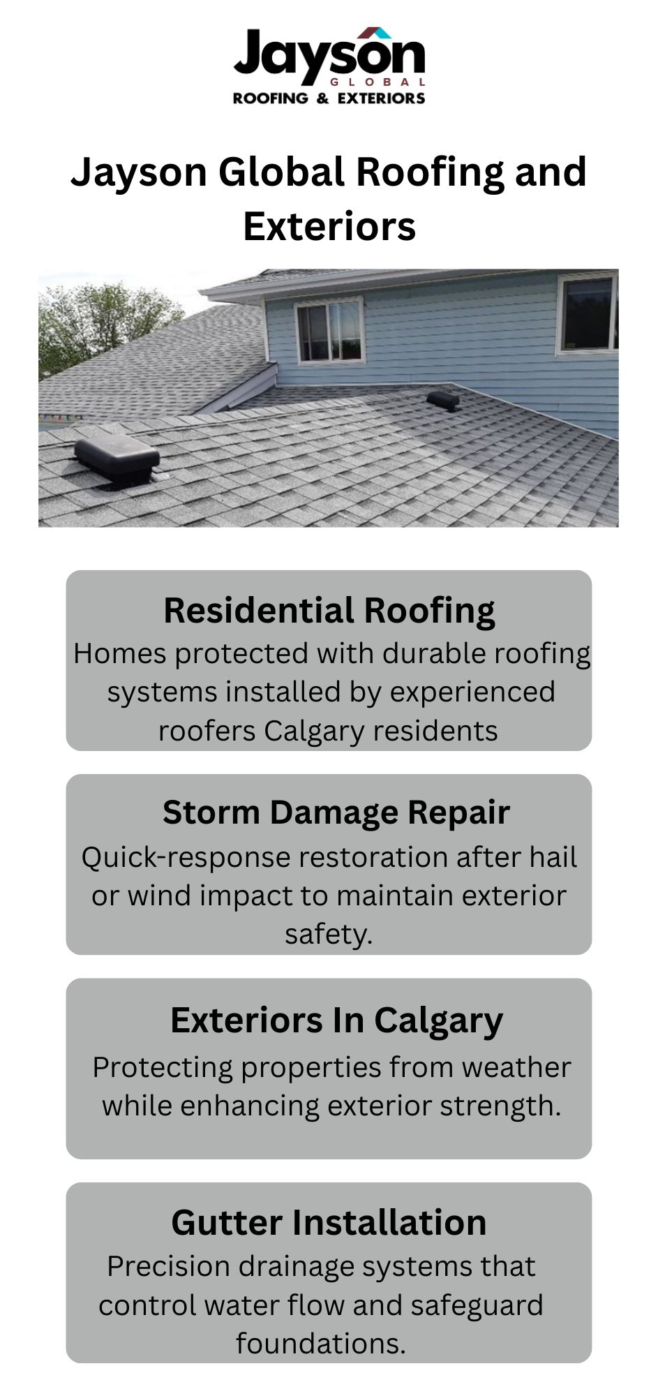 Jayson Global Roofing and Exteriors offers professional solutions with expert roofers in Calgary, providing reliable roofing and exterior services for durable, weather-resistant homes and buildings. Committed to quality craftsmanship and customer satisfaction on every project.