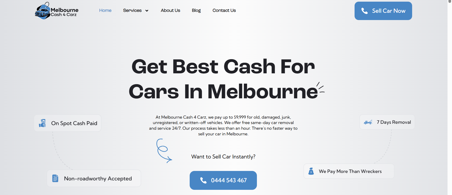 Melbourne Cash 4 Carz offers quick and hassle-free car removal services across Melbourne. We buy all types of vehicles, including old, damaged, or unwanted cars, and pay top cash on the spot. Enjoy free towing, same-day pickup, and instant payment with our trusted team.