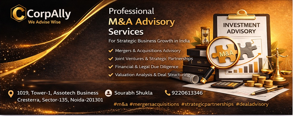 Professional M&A Advisory Services for Strategic Business Growth in India M&As are central to business enlargement, reorganization, and value creation over the longer term. In such a case, as the best M&A advisory company in India. CorpsAlly provides end-to-end advisory services related to acquisition mergers, JVs, and partnerships. We help clients with deal structuring, financial and legal due diligence, value analysis, and transaction negotiation. With a strong understanding of market dynamics and disciplined processes, we help companies successfully navigate complex sales with confidence. 📍 Address: 1019, Tower-1, Assotech Business Cresterra, Sector-135, Noida 201301 👤 Sourabh Shukla 📩 Email: contact@cpally.com 📞 Phone: 9220613346 🌐 Website: https://cpally.com 🕒 Mon ‐ Fri, 10:00 AM ‐ 6:30 PM