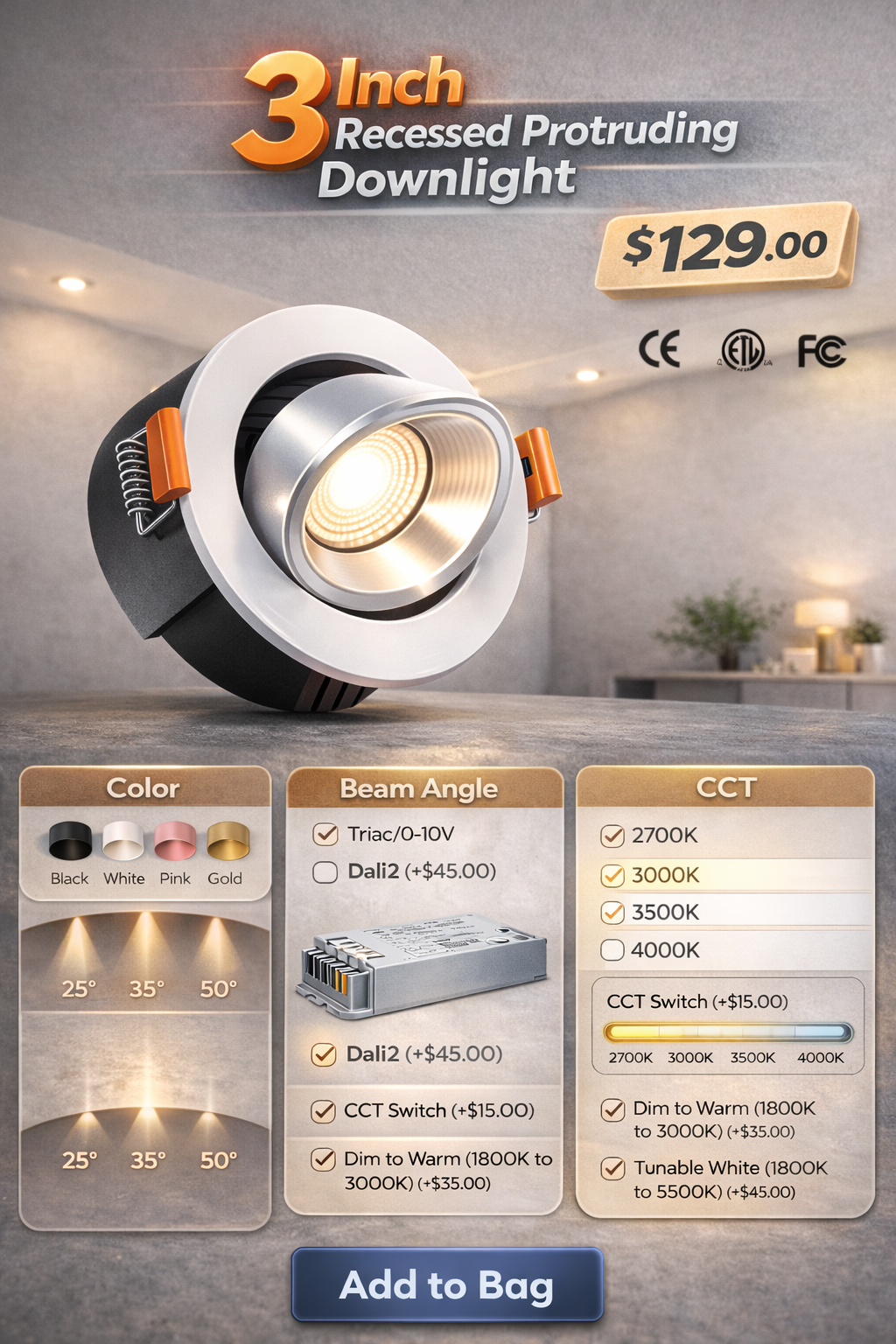 Upgrade your space with this premium 3” recessed protruding LED downlight, perfect for modern residential & commercial interiors. The semi-recessed design adds depth, refined ceiling detail & better glare control. High-CRI COB LED – vibrant & accurate colors Full aluminum body – strong thermal performance Smooth, fixed beam illumination Fully dimmable support Beam Angle: 25° / 35° / 50° Driver: Triac/0-10V or DALI2 (+$45) CCT: 2700K / 3000K / 3500K / 4000K CCT Switch (+$15) Dim to Warm (+$35) Tunable White (+$45) Available in Black, White, Pink & Gold Brand New Order now! https://nuordic.com/product/3-inch-recessed-protruding-downlight/