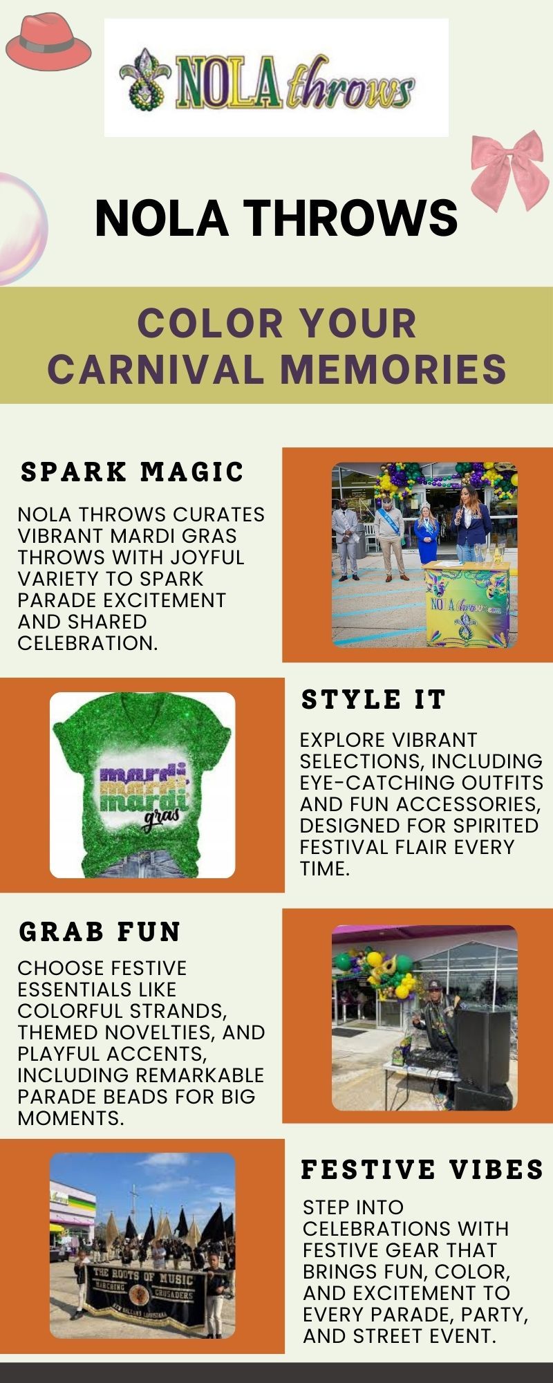NOLA Throws brings lively mardi gras clothes in New Orleans, featuring everything from bright, colorful shirts to parade-ready costumes and festive accessories. Each outfit adds fun, energy, and personality to block parties, second lines, and Bourbon Street celebrations, making every Carnival moment unforgettable.