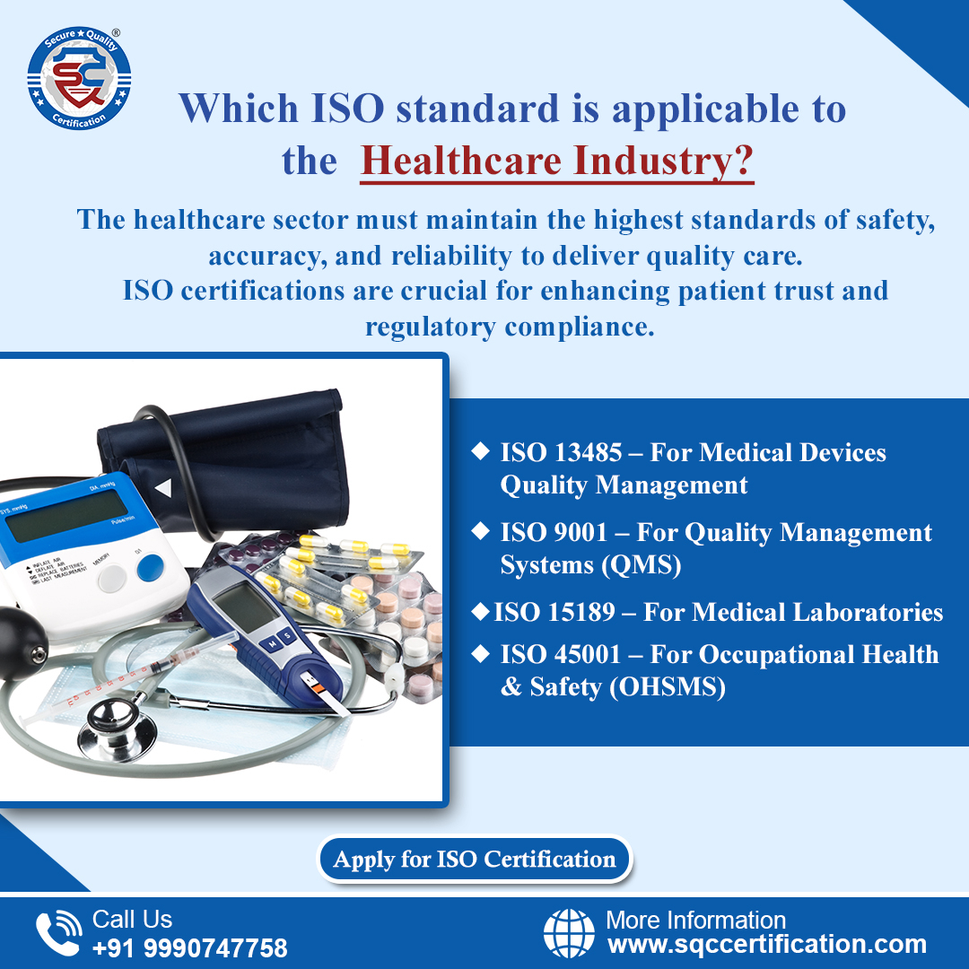 ISO Certification helps the healthcare industry maintain high standards of safety, quality, and efficiency in every service it provides. Whether it’s hospitals, clinics, laboratories, or medical equipment manufacturers, ISO standards ensure that patient care is consistent, reliable, and well-managed. #ISO #ISOIndia #ISOStandard #ISOCertification #Sqccertification #HealthcareIndustry