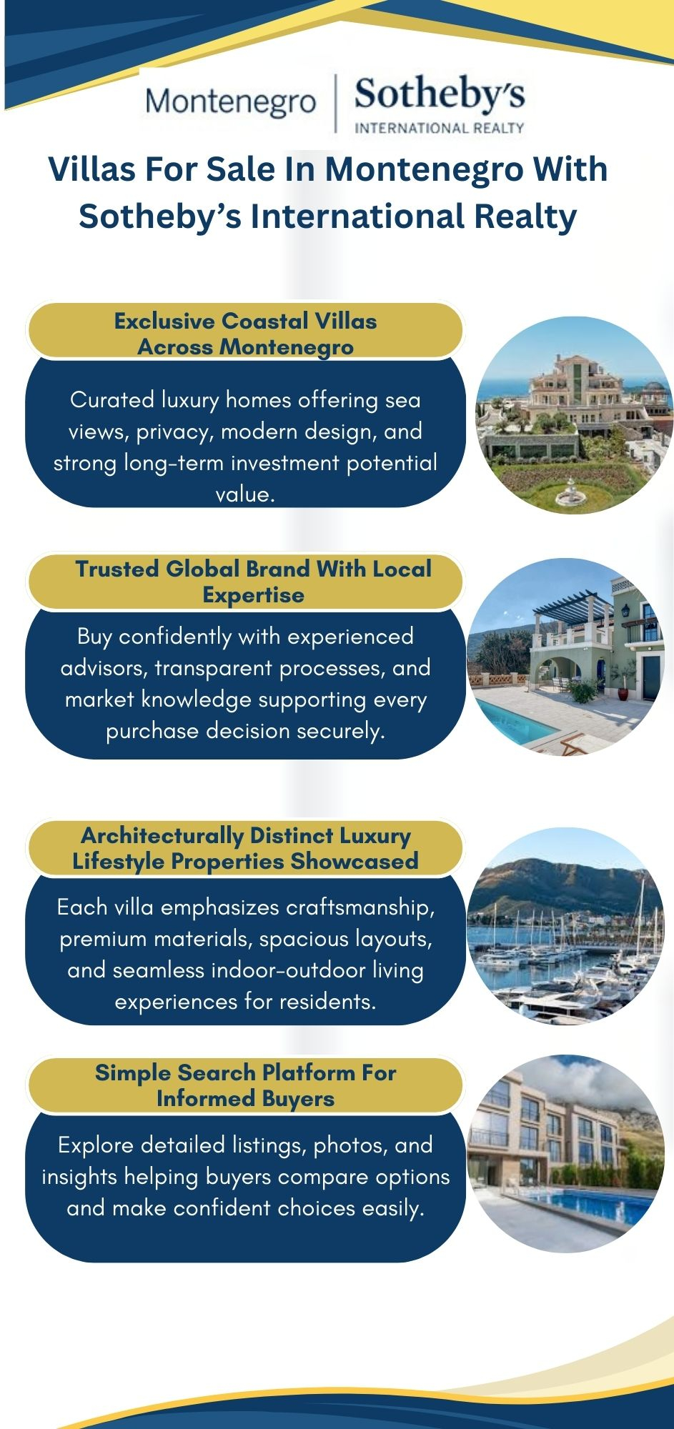 Sotheby’s International Realty presents an exclusive selection of villas for sale in Montenegro, tailored for buyers seeking refined coastal and lifestyle properties. The platform highlights premium listings, architectural quality, and expert guidance for informed decisions.