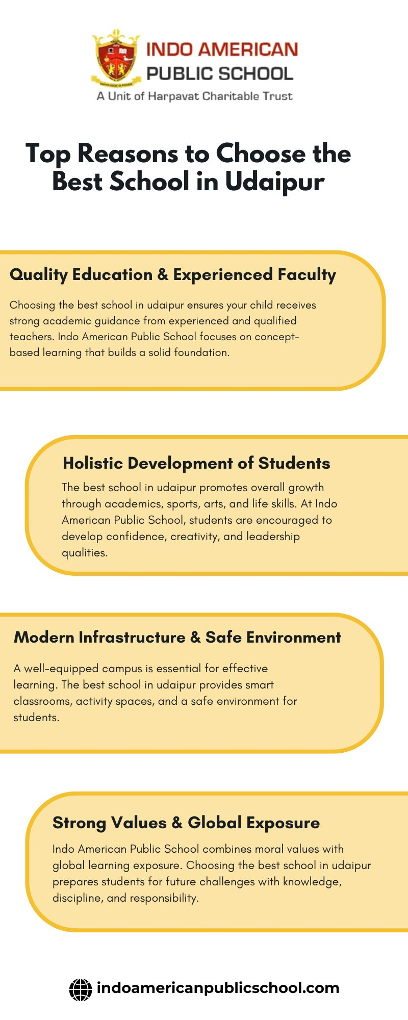Top Reasons to Choose the Best School in Udaipur 1. Quality Education & Experienced Faculty Choosing the best school in udaipur ensures your child receives strong academic guidance from experienced and qualified teachers. Indo American Public School focuses on concept-based learning that builds a solid foundation. 2. Holistic Development of Students The best school in udaipur promotes overall growth through academics, sports, arts, and life skills. At Indo American Public School, students are encouraged to develop confidence, creativity, and leadership qualities. 3. Modern Infrastructure & Safe Environment A well-equipped campus is essential for effective learning. The best school in udaipur provides smart classrooms, activity spaces, and a safe environment for students. 4. Strong Values & Global Exposure Indo American Public School combines moral values with global learning exposure. Choosing the best school in udaipur prepares students for future challenges with knowledge, discipline, and responsibility. Visit Us - https://indoamericanpublicschool.com/