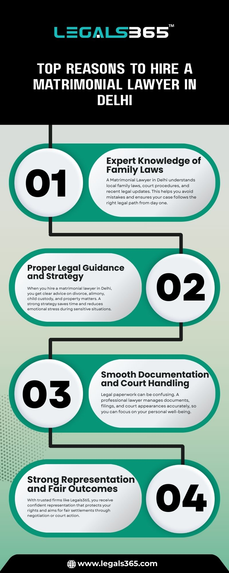 Top Reasons to Hire a Matrimonial Lawyer in Delhi 1. Expert Knowledge of Family Laws A Matrimonial Lawyer in Delhi understands local family laws, court procedures, and recent legal updates. This helps you avoid mistakes and ensures your case follows the right legal path from day one. 2. Proper Legal Guidance and Strategy When you hire a matrimonial lawyer in Delhi, you get clear advice on divorce, alimony, child custody, and property matters. A strong strategy saves time and reduces emotional stress during sensitive situations. 3. Smooth Documentation and Court Handling Legal paperwork can be confusing. A professional lawyer manages documents, filings, and court appearances accurately, so you can focus on your personal well-being. 4. Strong Representation and Fair Outcomes With trusted firms like Legals365, you receive confident representation that protects your rights and aims for fair settlements through negotiation or court action. Visit Us - https://www.legals365.com/best-matrimonial-lawyers-in-delhi/
