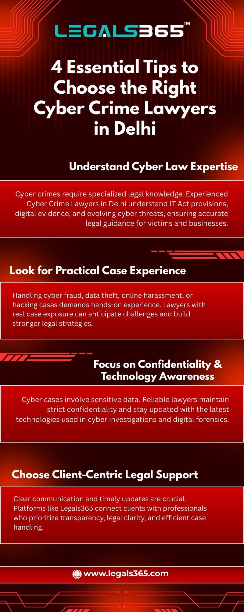 4 Essential Tips to Choose the Right Cyber Crime Lawyers in Delhi 1. Understand Cyber Law Expertise Cyber crimes require specialized legal knowledge. Experienced Cyber Crime Lawyers in Delhi understand IT Act provisions, digital evidence, and evolving cyber threats, ensuring accurate legal guidance for victims and businesses. 2. Look for Practical Case Experience Handling cyber fraud, data theft, online harassment, or hacking cases demands hands-on experience. Lawyers with real case exposure can anticipate challenges and build stronger legal strategies. 3. Focus on Confidentiality & Technology Awareness Cyber cases involve sensitive data. Reliable lawyers maintain strict confidentiality and stay updated with the latest technologies used in cyber investigations and digital forensics. 4. Choose Client-Centric Legal Support Clear communication and timely updates are crucial. Platforms like Legals365 connect clients with professionals who prioritize transparency, legal clarity, and efficient case handling. Visit Us - https://www.legals365.com/cyber-crime-lawyers-in-delhi/