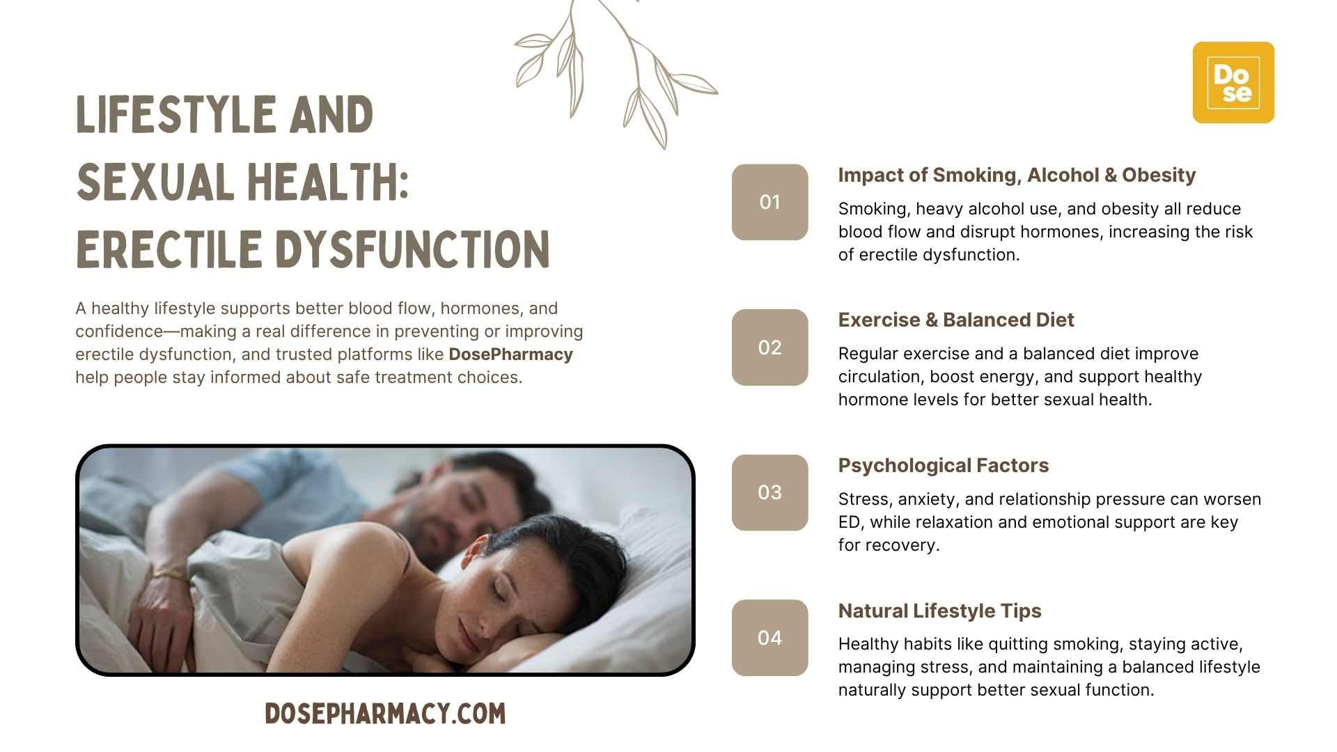 Can daily lifestyle habits affect erectile performance? Yes, daily lifestyle habits can strongly affect erectile performance. Factors like poor diet, lack of exercise, smoking, excessive alcohol, and high stress can reduce blood flow and lower energy levels, making it harder to get or maintain an erection. Being overweight or not sleeping enough can also affect hormone balance, including testosterone. On the positive side, healthy habits—such as regular physical activity, balanced nutrition, good sleep, and stress management—can significantly improve sexual health. Small changes like quitting smoking or reducing alcohol can make a noticeable difference. A healthier lifestyle supports better blood circulation, stronger erections, and improved overall confidence. To treat ED visit : https://www.dosepharmacy.com/vilitra-60mg-tablet