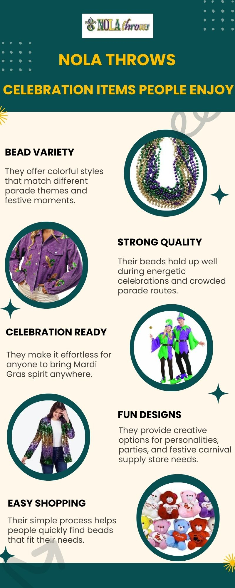 NOLA Throws is a vibrant parade beads provider, perfect for bringing fun and color to every celebration. They offer high-quality mardi gras beads in a variety of styles and colors, ensuring memorable moments at every parade. Customers trust them for safe, festive, and exciting beads that add energy to any event.