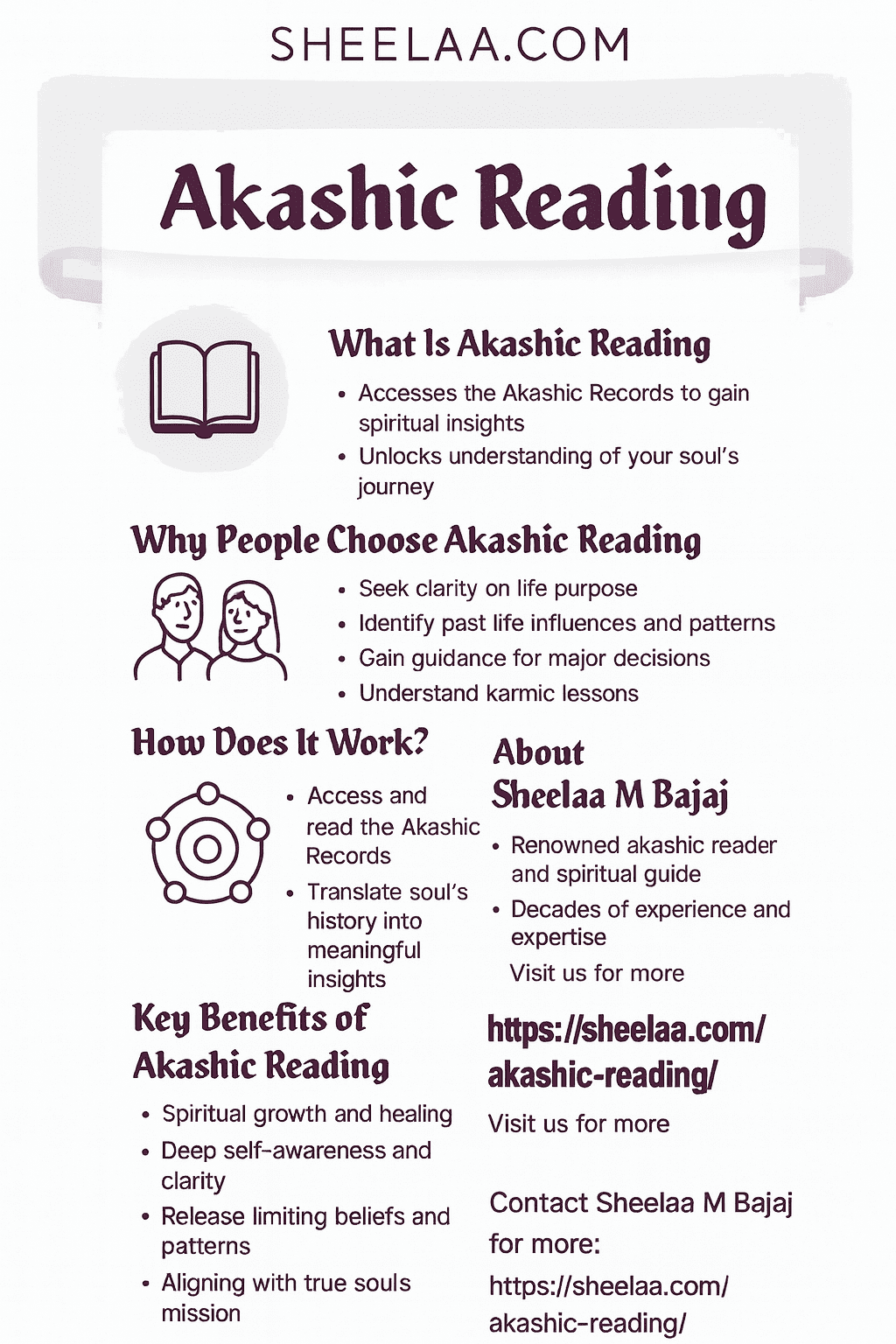 Unlock deep spiritual insights with Akashic Reading to understand your soul’s journey, patterns, and purpose. Guided by the expertise of Dr. Sheelaa M Bajaj, this transformative experience brings clarity, healing, and alignment with your true path. Visit : https://sheelaa.com/akashic-reading/