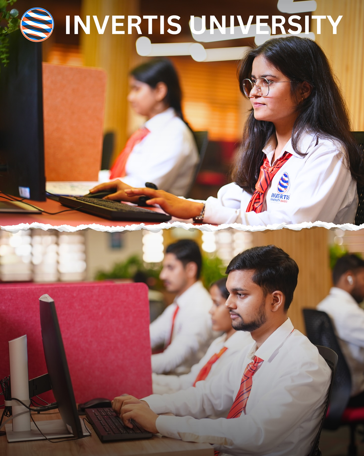 "Students Exploring the Digital Learning World at Invertis E-Library" highlights how students immerse themselves in an interactive, tech-driven environment, accessing a vast range of digital resources. This modern e-library fosters academic growth, offering a dynamic platform for research, learning, and knowledge exchange, enhancing the student experience.