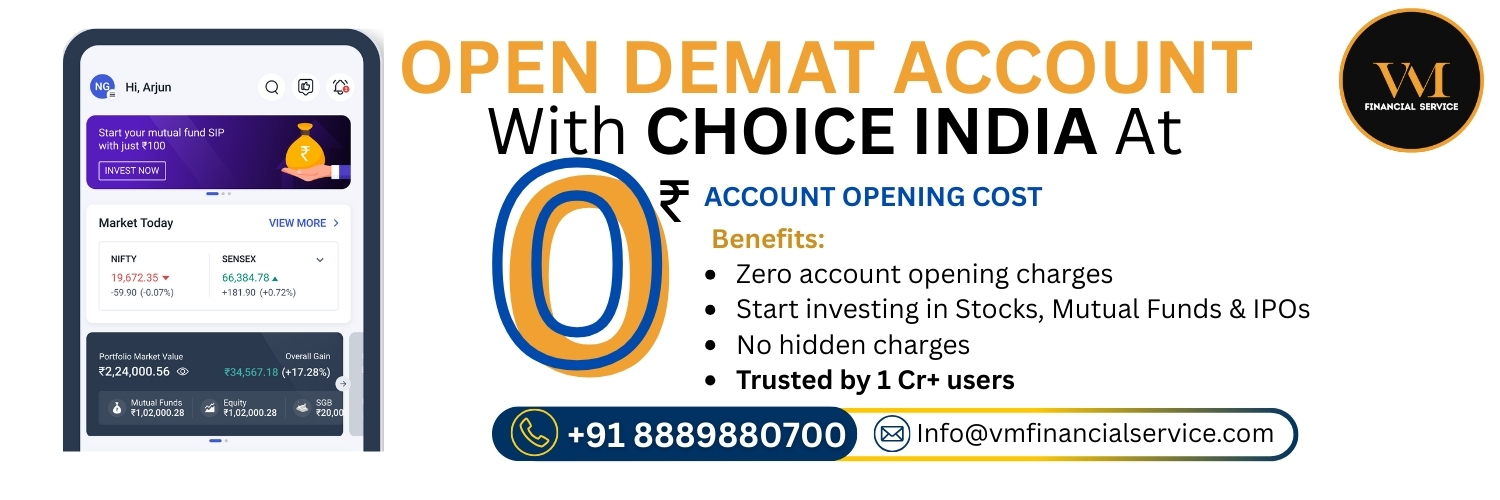 VM Financial Service is a trusted financial solutions provider offering stock broking, portfolio management, and investment advisory with personalized support. Backed by Choice Equity Broking Pvt. Ltd., we provide a wide range of investment options including equities, derivatives, commodities, currencies, mutual funds, and IPOs — all on one seamless 6-in-1 account platform. With 7500+ satisfied users, we focus on empowering investors through technology-driven solutions, reliable guidance, and transparent pricing. Our mission is to help clients invest with trust and grow with confidence while ensuring compliance, security, and professional support at every step.