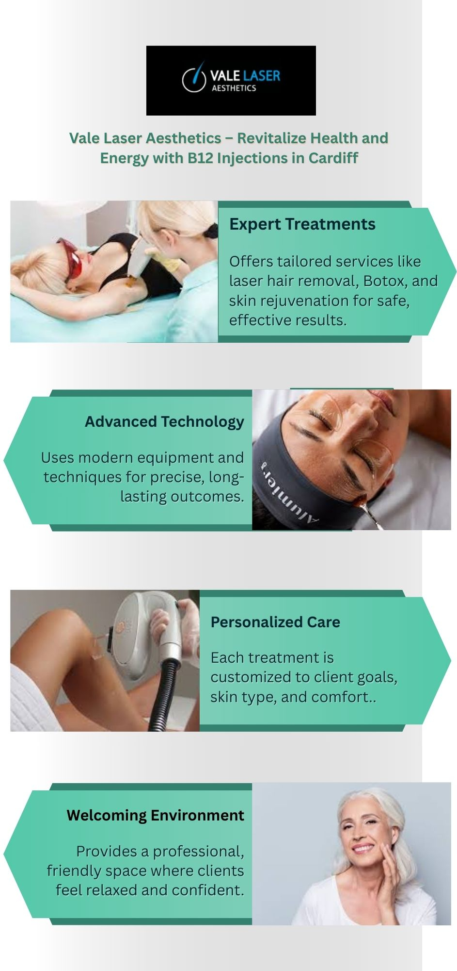 Vale Laser Aesthetics offers B12 injections in Cardiff designed to boost energy, support immunity, and enhance overall wellness. Administered by trained specialists, each session is safe, comfortable, and tailored to individual health goals. Clients can experience improved vitality and a sense of well-being in a professional, welcoming setting that prioritizes personalized care and effective results.