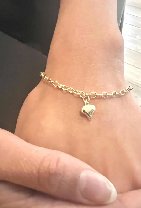 Add a touch of elegance with this 14K real gold heart charm bracelet. Featuring a delicate 7-inch rolo link chain and a charming 3D puffed heart, this 3.2mm dainty bracelet is perfect for everyday wear or special occasions. Its lightweight design makes it comfortable for layering with other bracelets or wearing alone as a subtle statement piece.